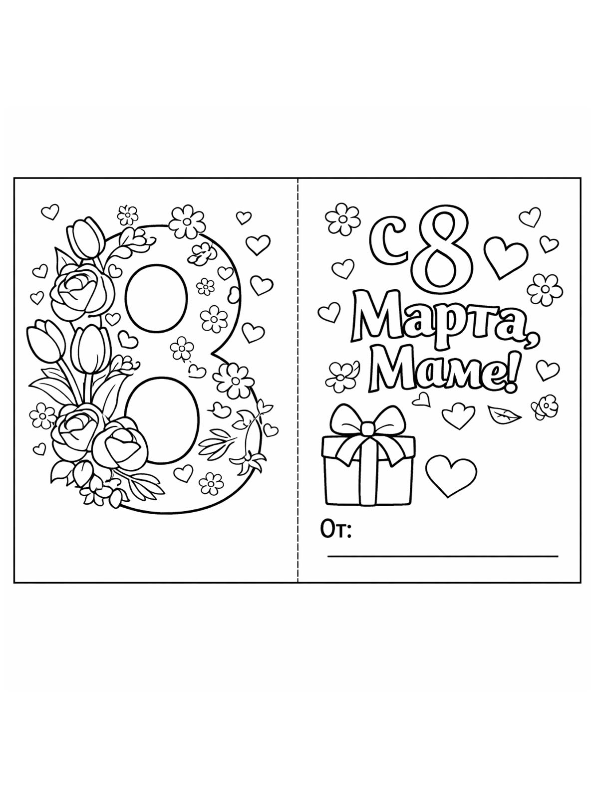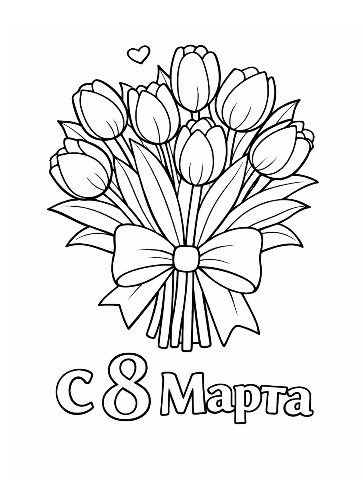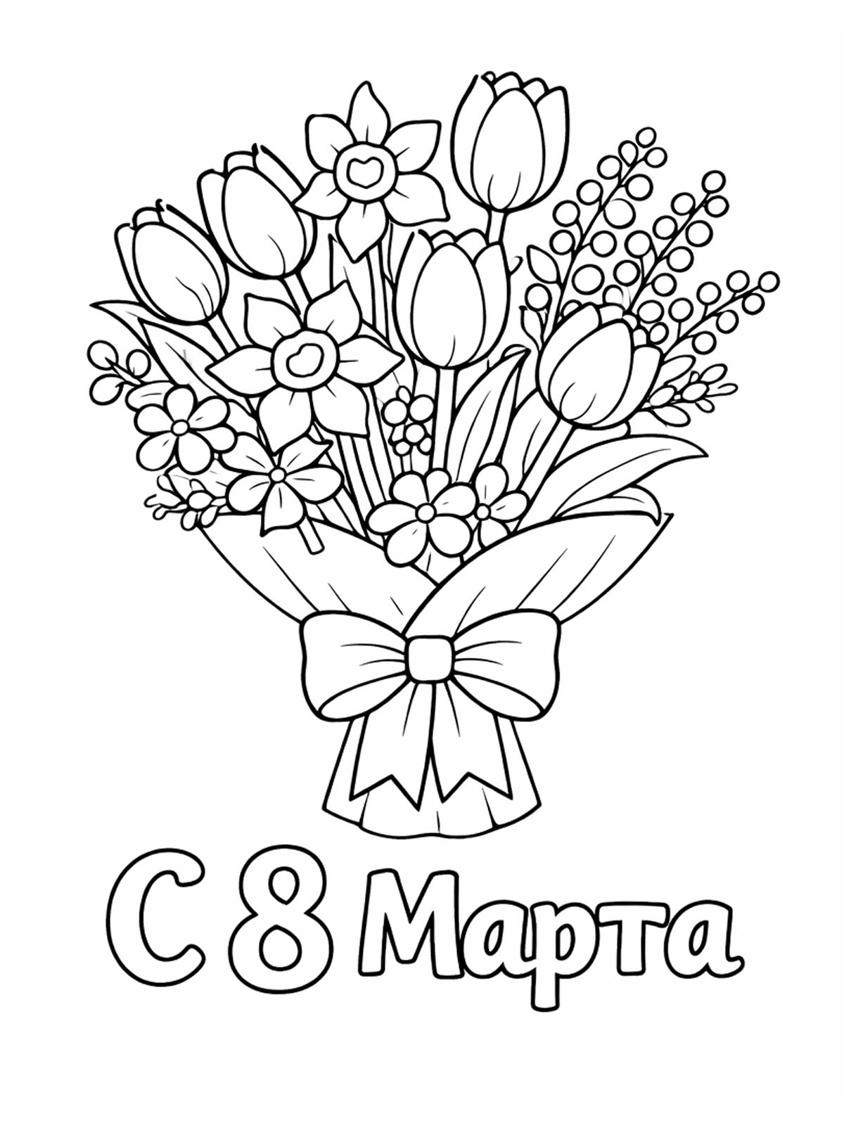 Раскраски к 8 Марта — это детские рисунки, посвящённые Международному женскому дню. В коллекции представлены открытки, цветы, поздравительные надписи «8 Марта», рисунки для мамы и бабушки, а также милые животные с подарками. Такие раскраски подойдут для детского сада и школы: дети смогут аккуратно раскрасить тюльпаны, ромашки, букеты и праздничные открытки, чтобы порадовать своих близких. Простые контуры делают изображения удобными для малышей. Вы можете бесплатно скачать и распечатать раскраски к 8 Марта в формате А4 и подготовить красивый подарок своими руками.