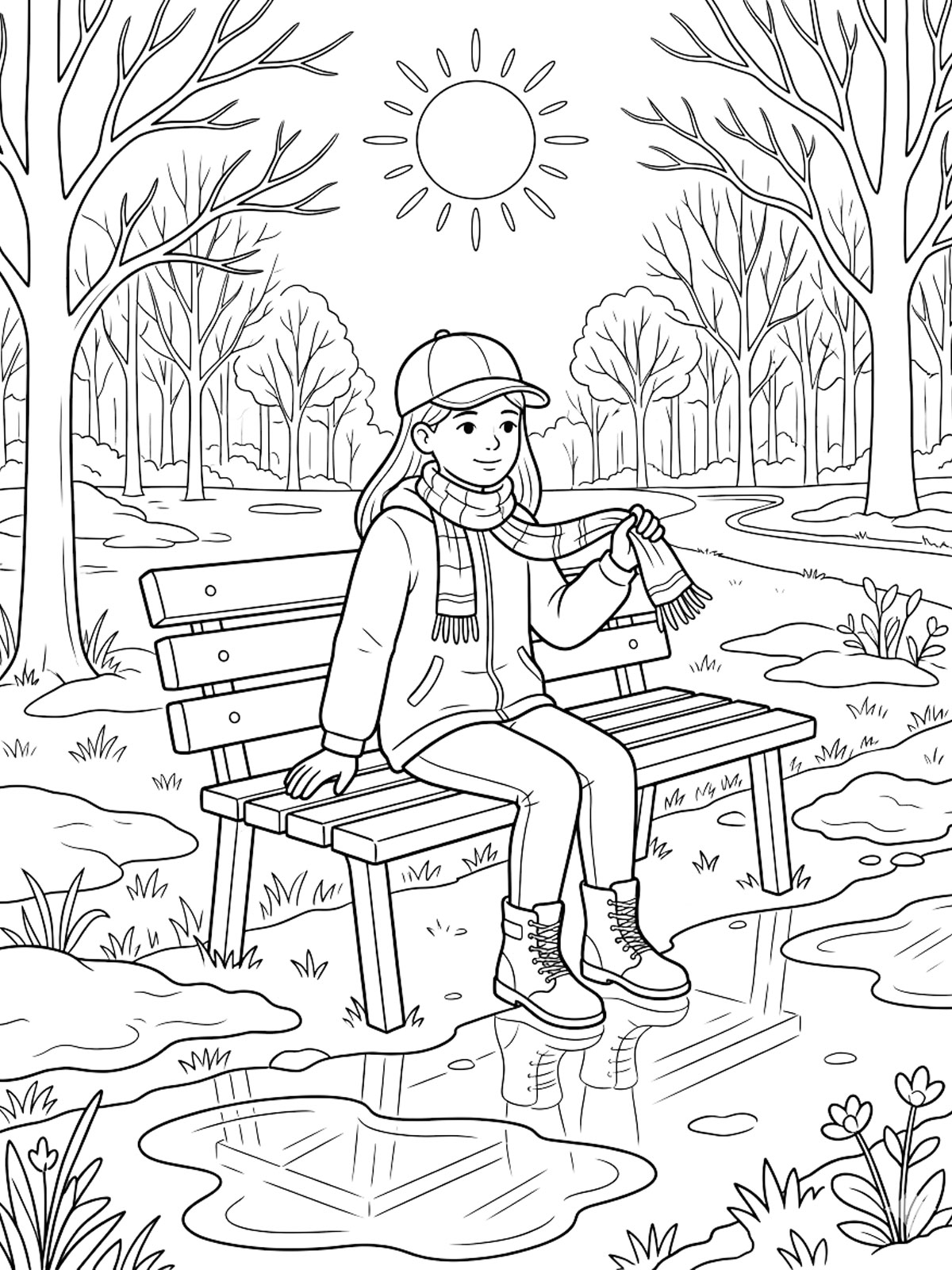 Мы собрали весенние раскраски разные по сюжету и по наполнению: где-то больше природы, где-то детей, птиц, ручьёв и тающего снега. За счёт этого можно выбрать и совсем простые картинки, и варианты с более интересными мелочами. Здесь хорошо видны именно признаки весны: мокрые дорожки, первые листья, цветы, тёплое солнце после зимы.