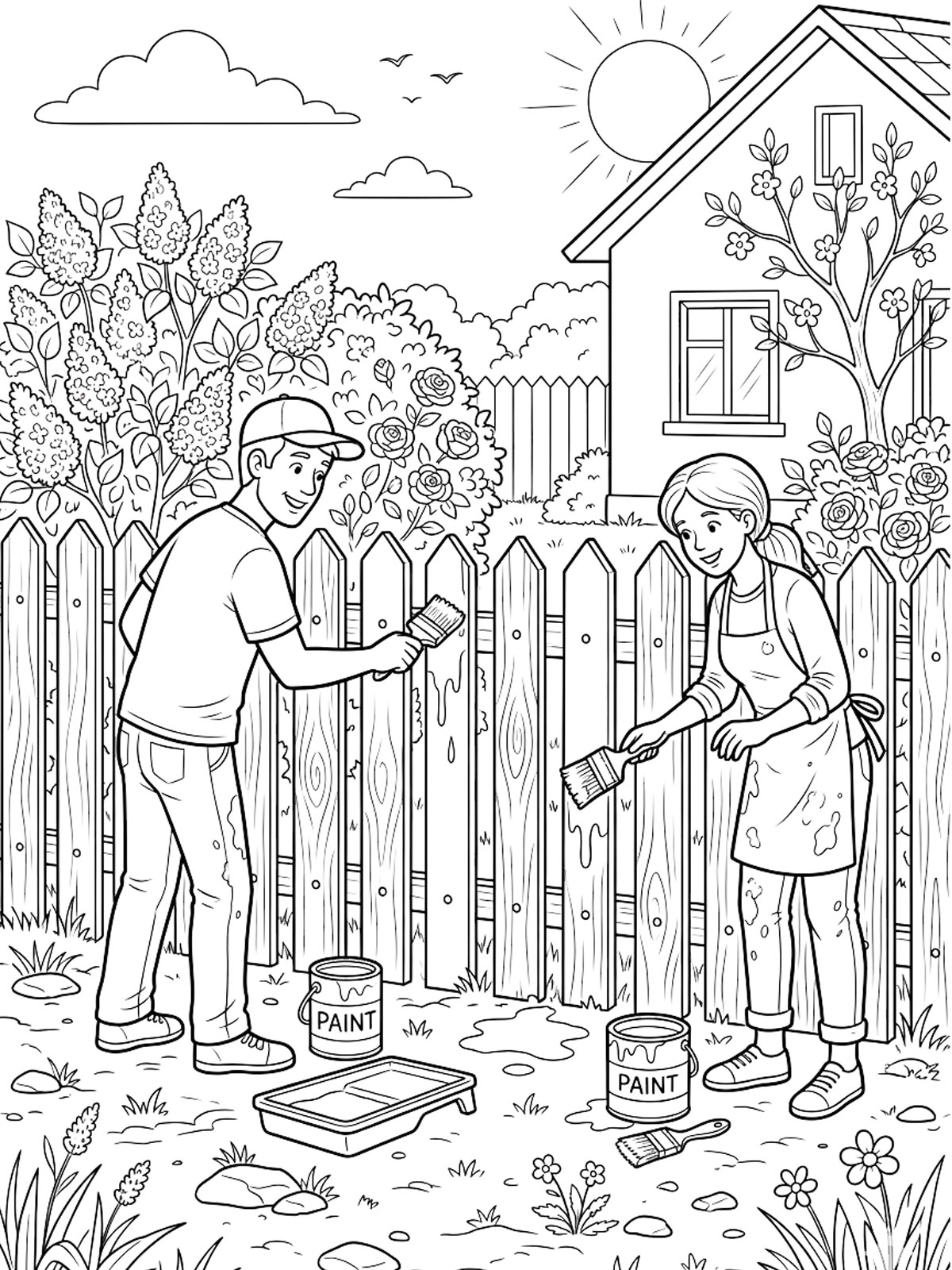 Муж и жена красят забор
