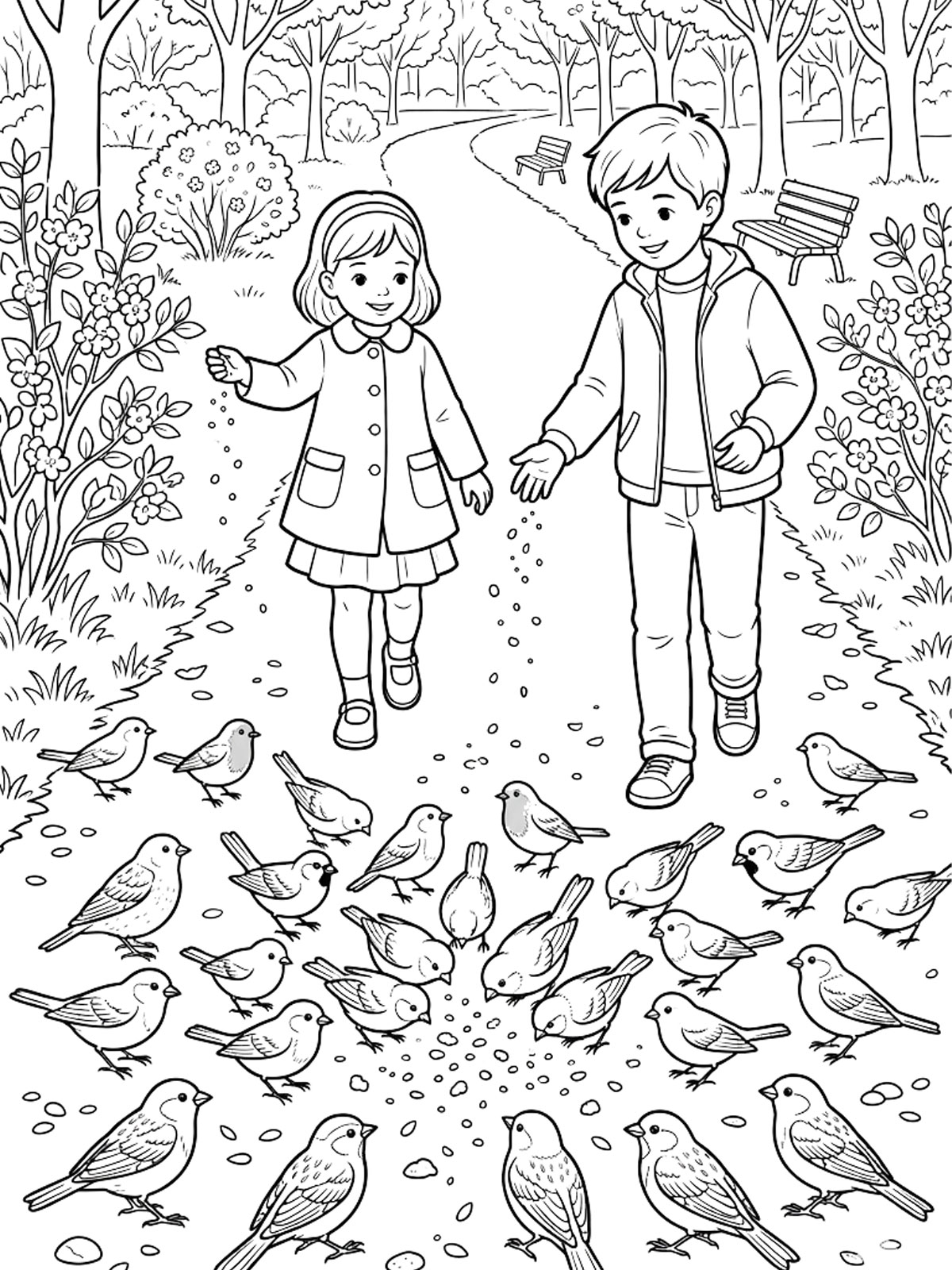 Мальчик и девочка кормят птиц
