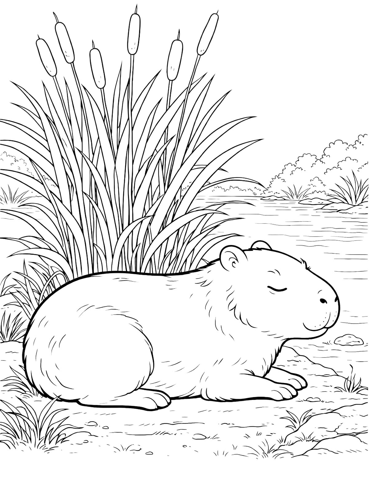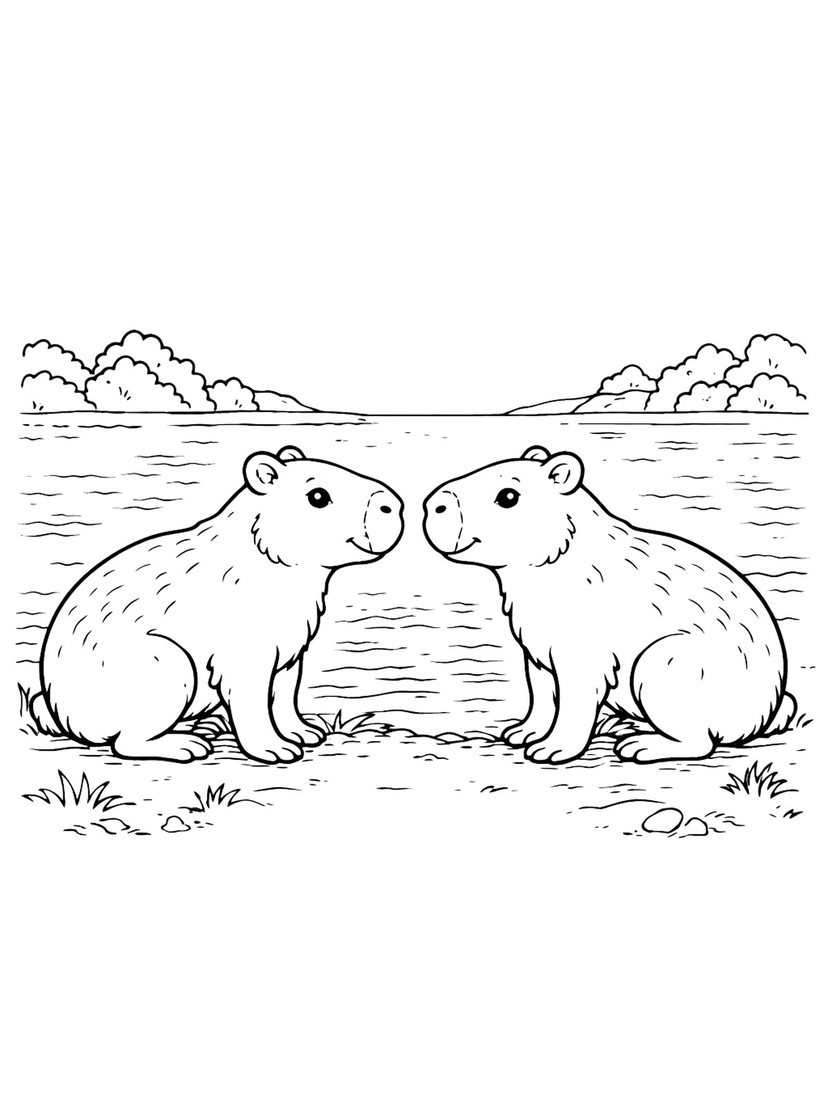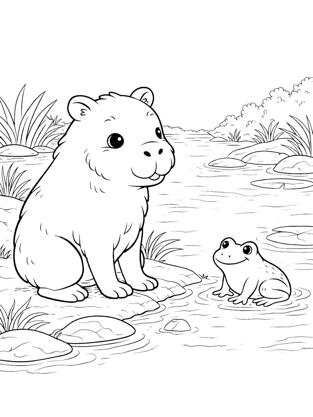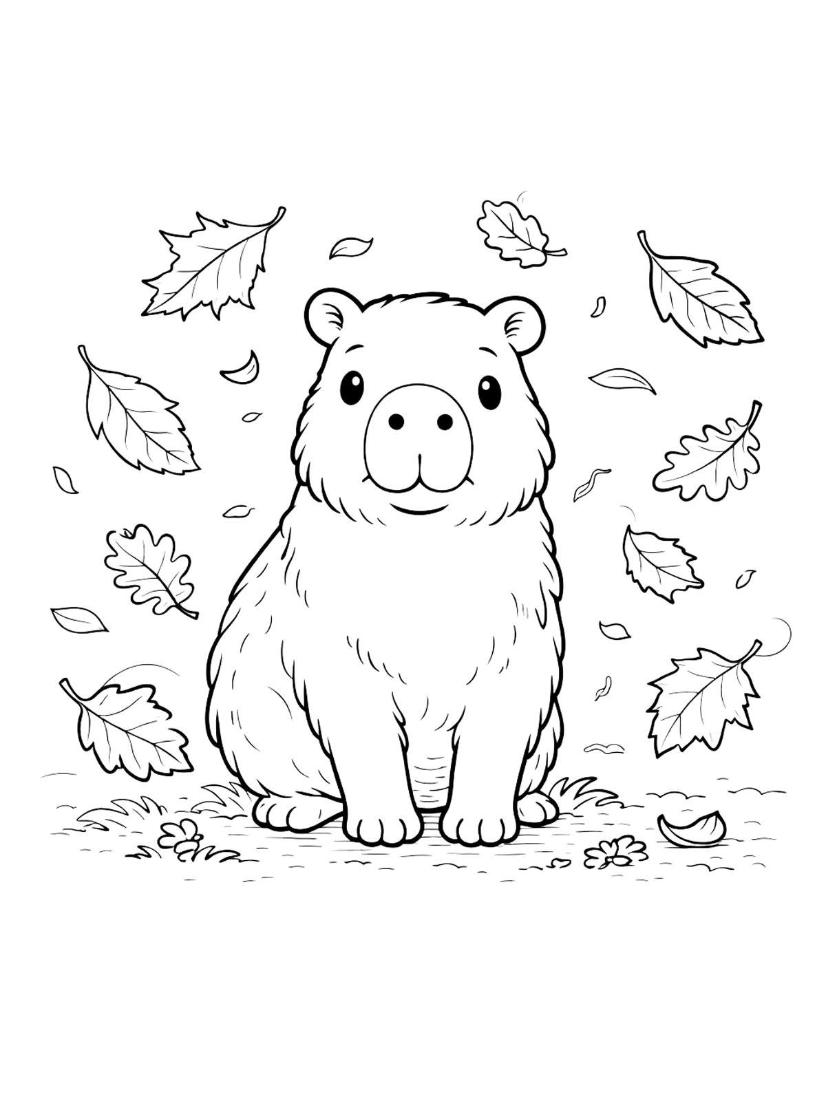 Капибара в этих раскрасках показана в разных вариантах: где-то рисунок строится на крупном силуэте и спокойном выражении мордочки, а где-то характер меняют небольшие детали в образе.