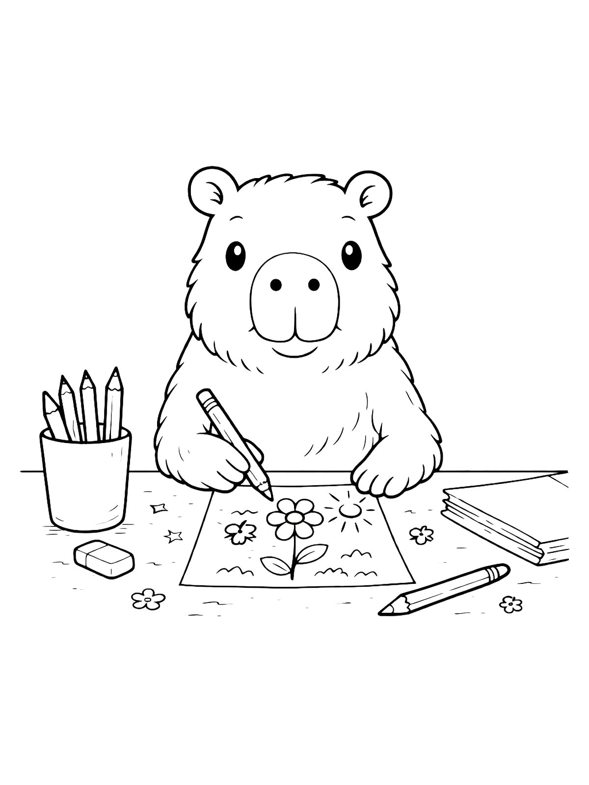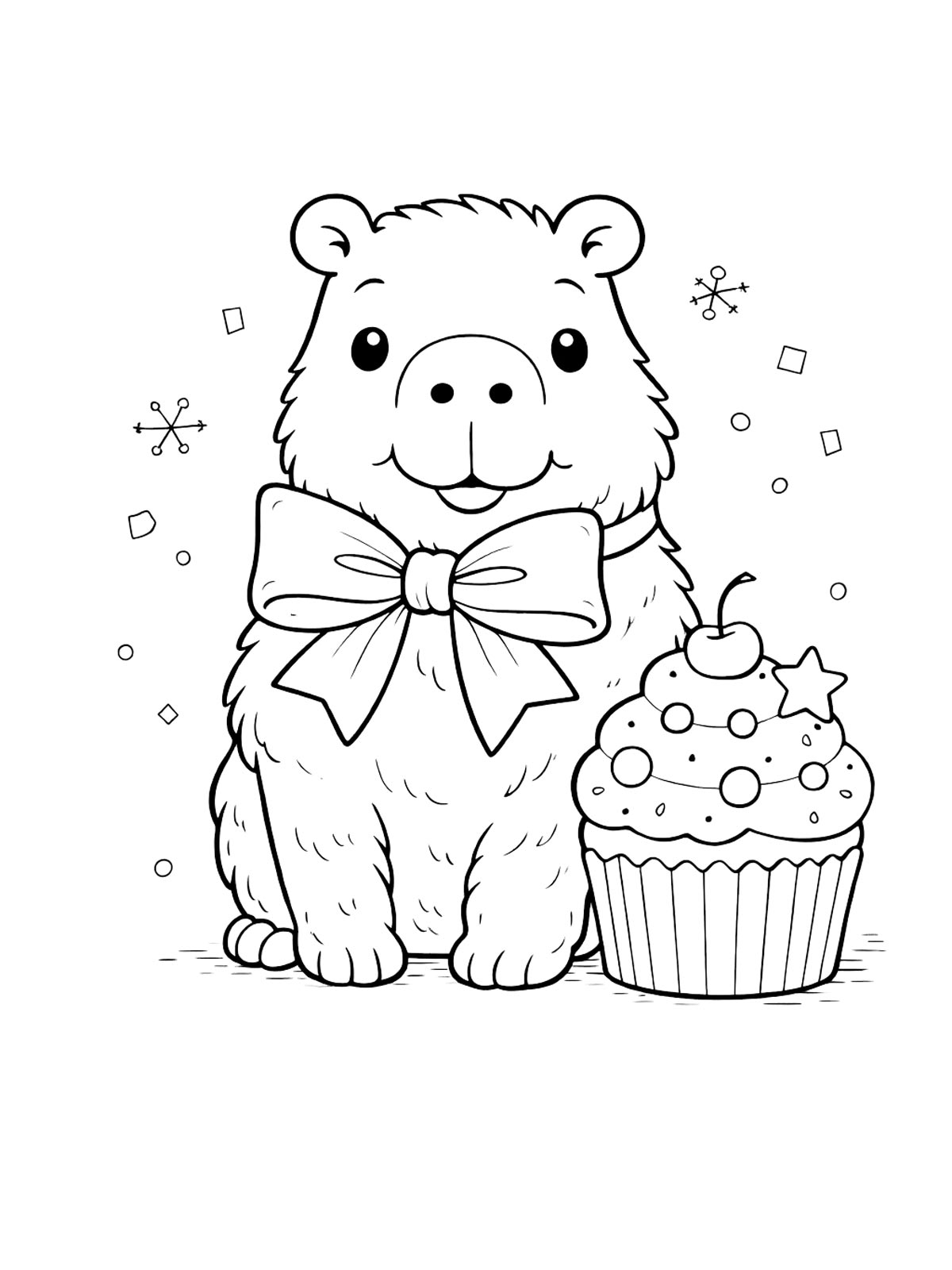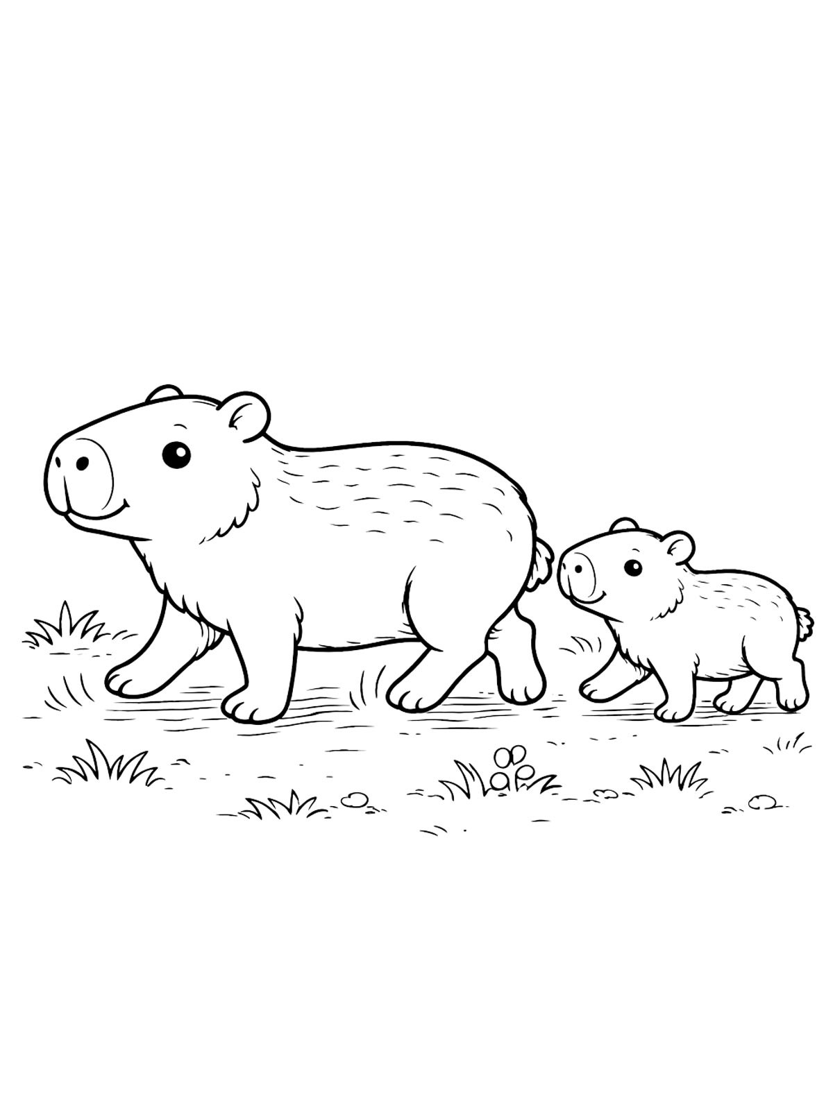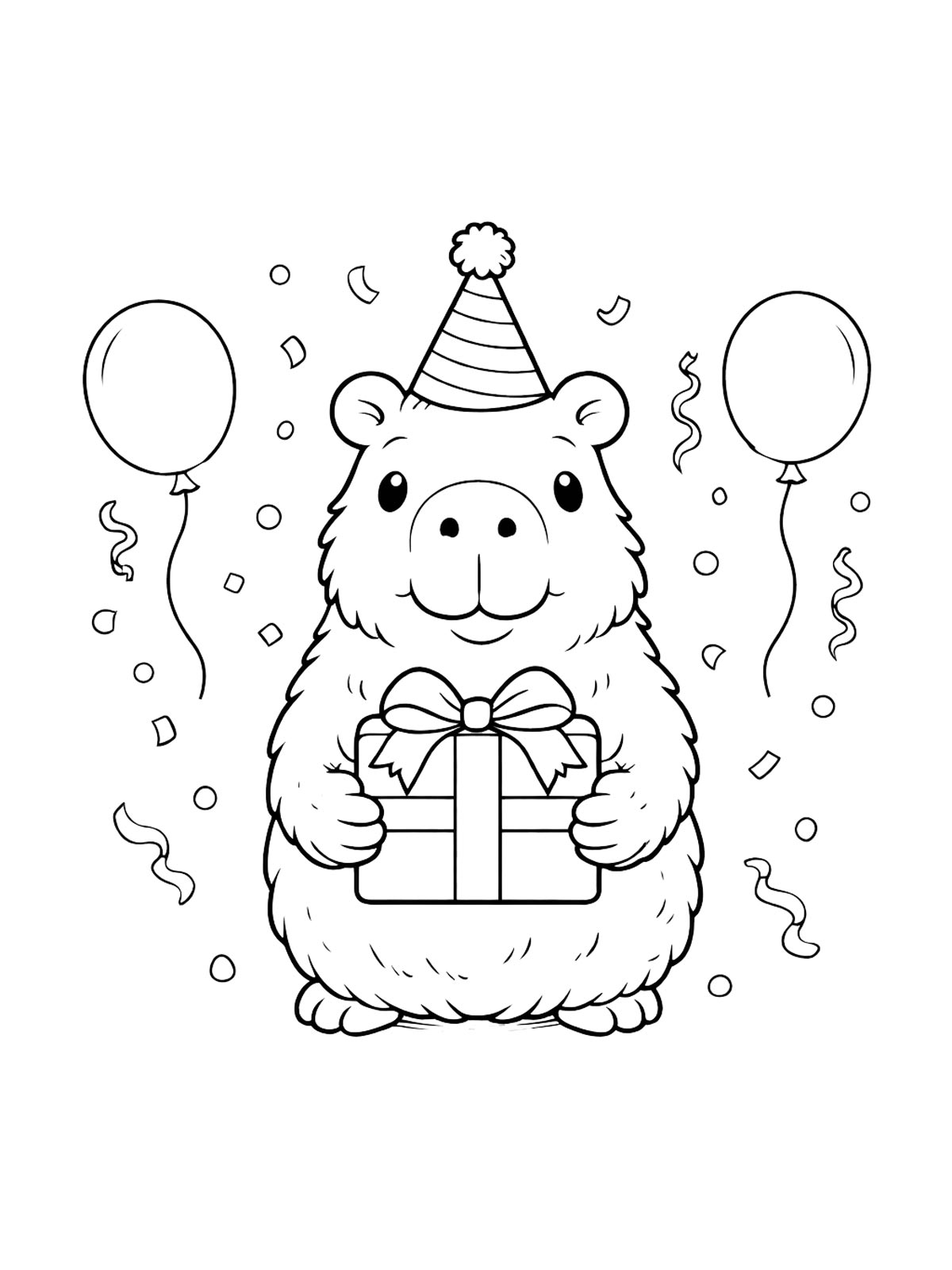 Раскраски капибара — это милые рисунки с капибарой в разных образах: в шляпе, с бантиком и с детёнышем. Есть и более простые картинки, и варианты с заметными деталями.