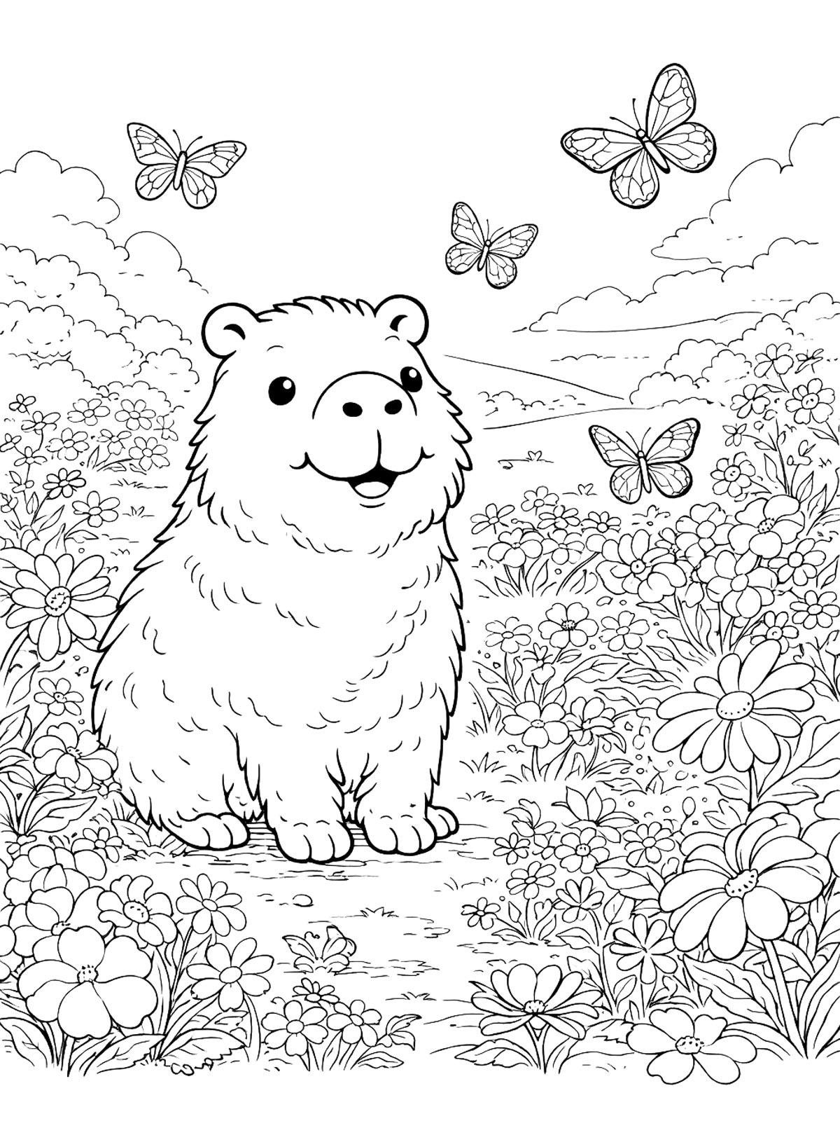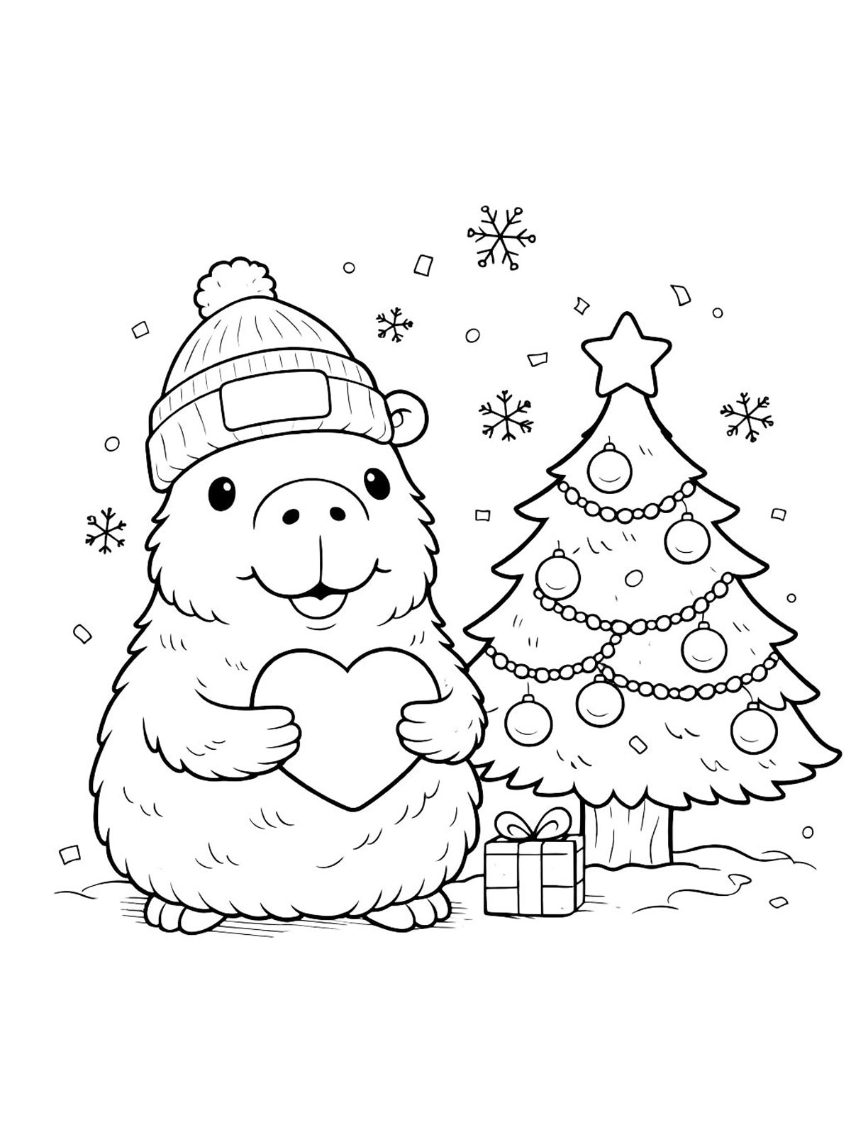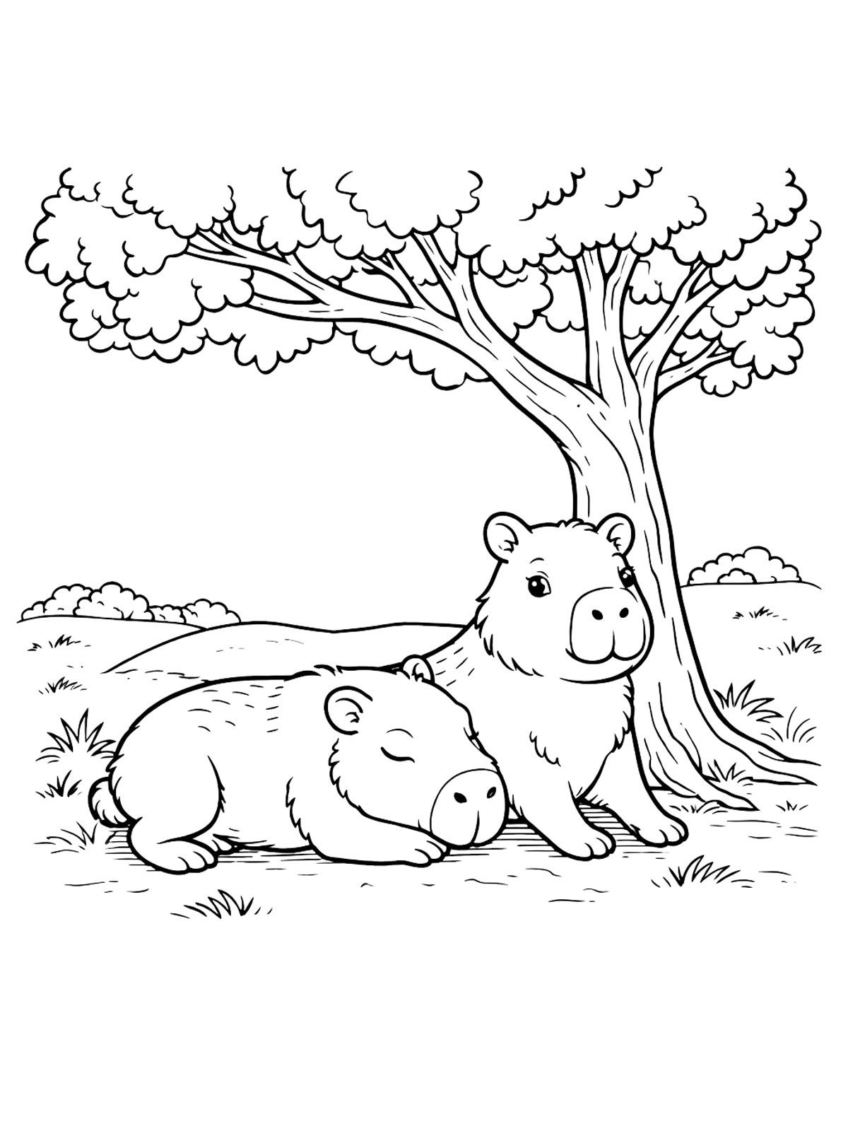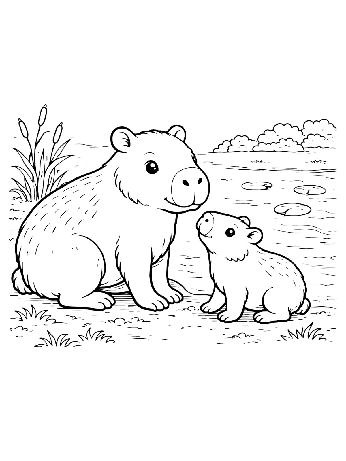 Раскраски капибара — это милые рисунки с капибарой в разных образах: в шляпе, с бантиком и с детёнышем. Есть и более простые картинки, и варианты с заметными деталями.