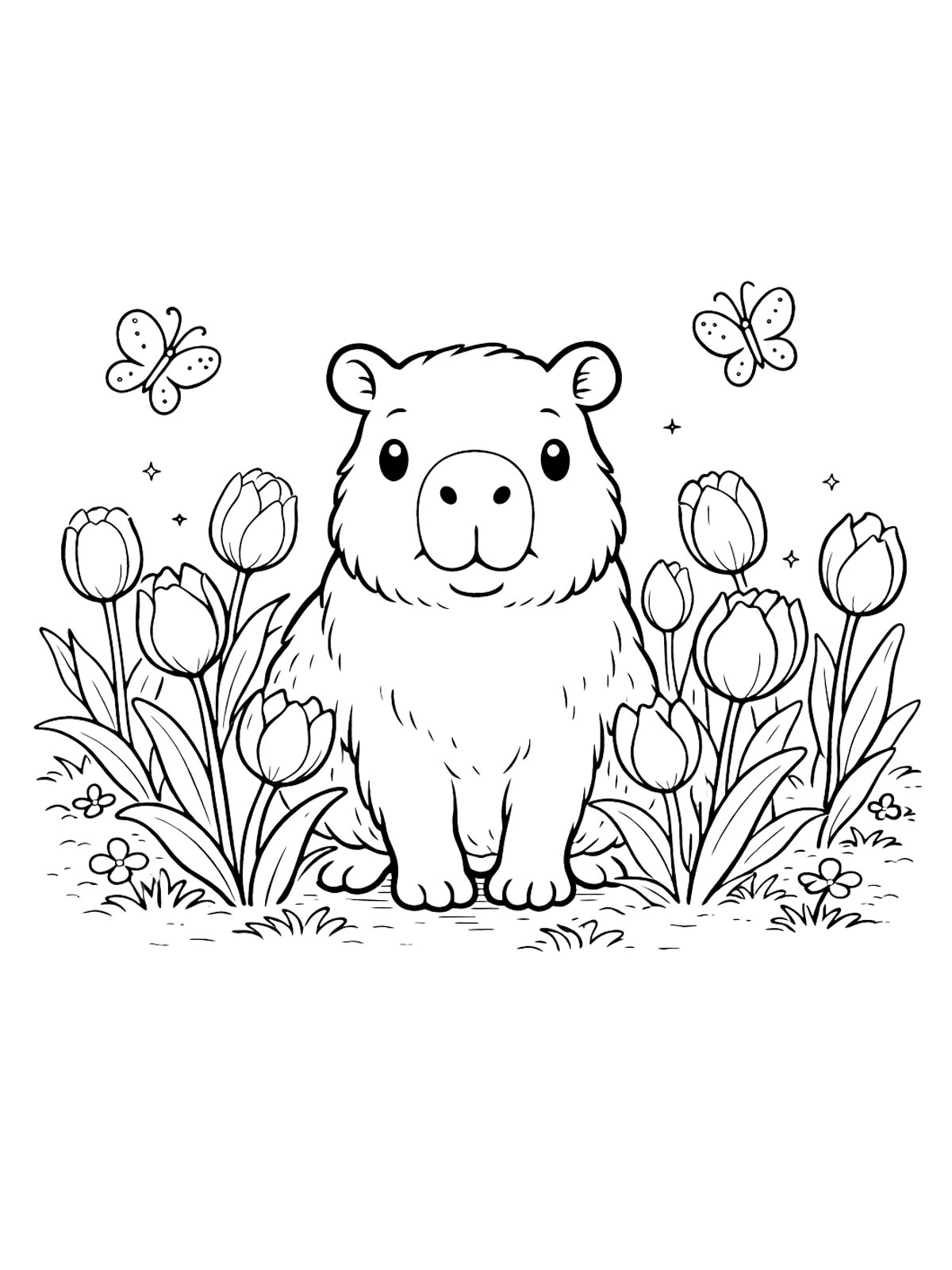 Капибара с тюльпанами