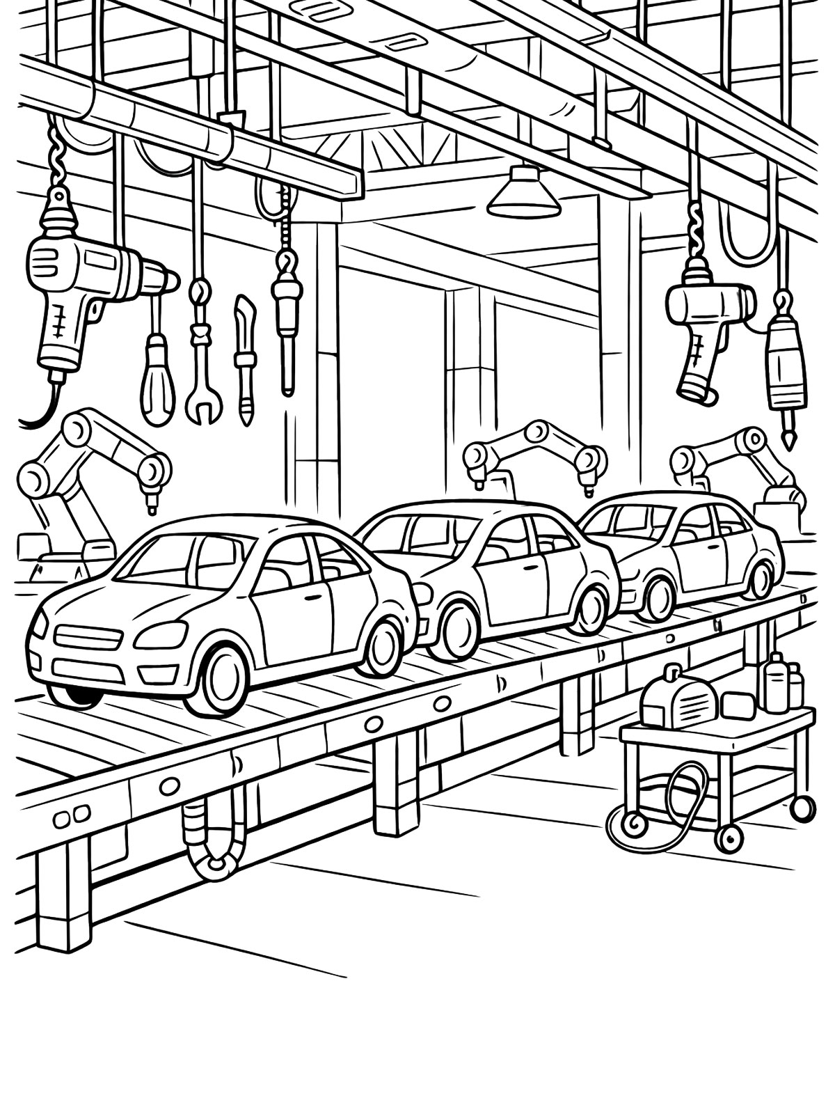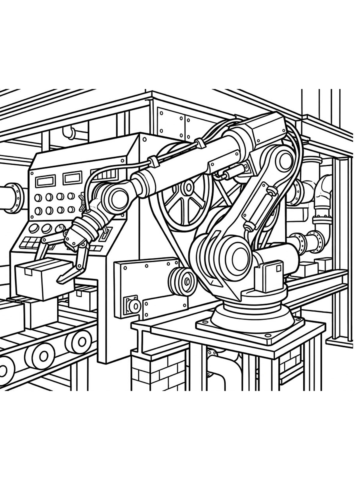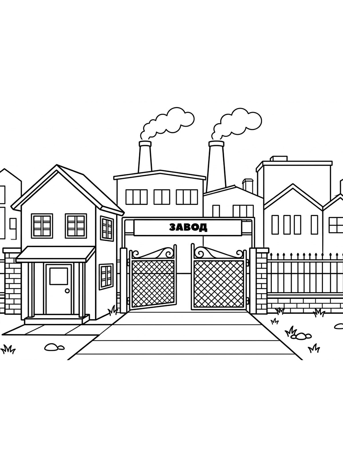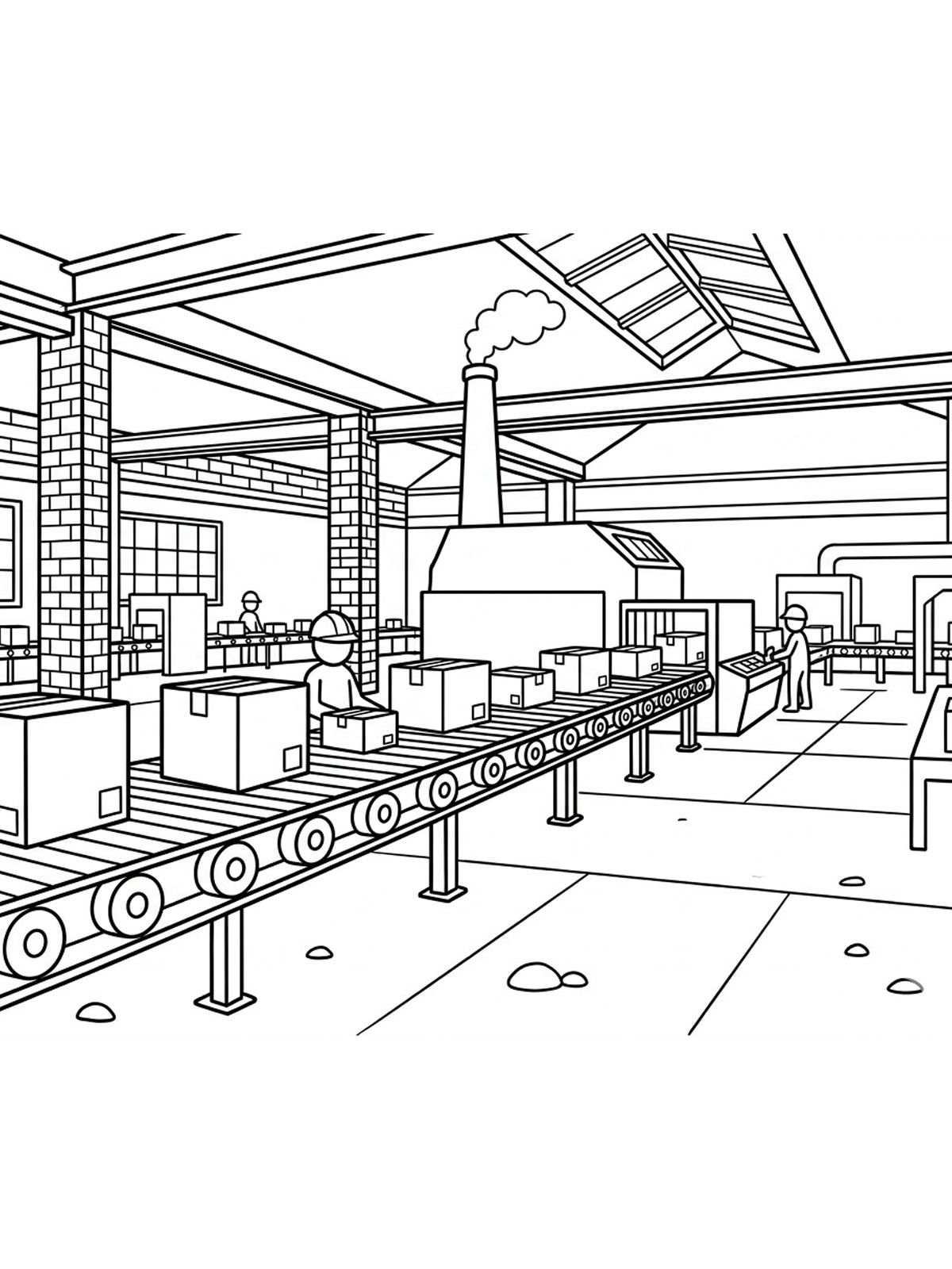 В раскрасках заводов есть и общие виды крупных предприятий с трубами, цехами и корпусами, и более детальные сцены внутри производства со станками, конвейерами и рабочей техникой.
