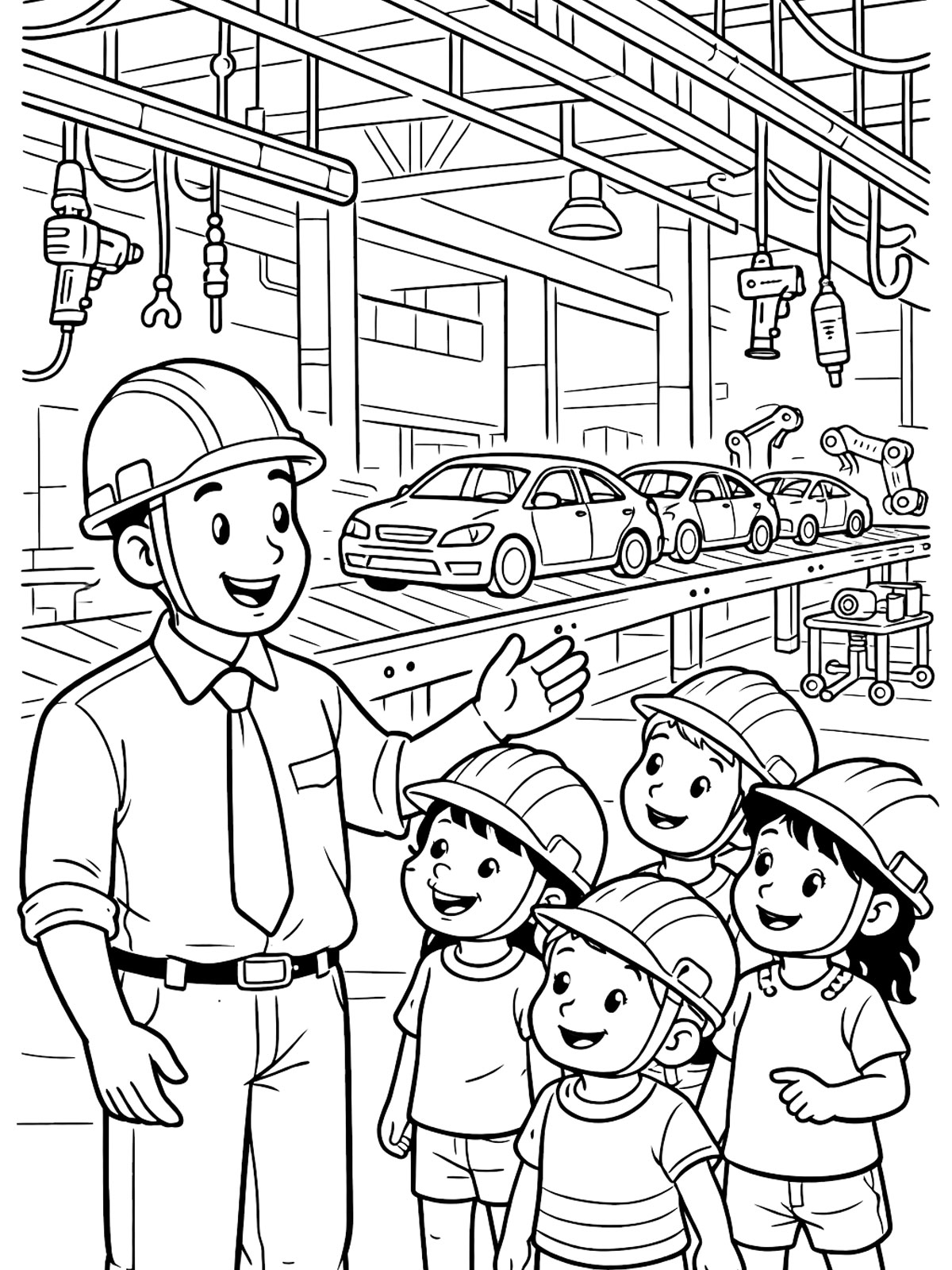 Раскраски Завод — это картинки с заводом, детьми на экскурсии, автомобильным и танковым заводом. На странице есть и более общие рисунки, и изображения с конкретной темой производства.